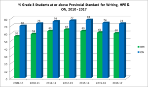 The proportion of grade 3 students who meet the provincial standard in HPE is consistently lower than the provincial average. However, there has been a substantial improvement in the last five years, even though the gap between the students in HPE and those in Ontario is closing slightly. Despite the Ministry of Education goal of 75% of children at or above the provincial standard, just over 60% of grade 3 students in HPE now meet or exceed that standard.