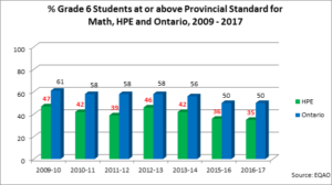 Hastings Prince Edward has not seen an improvement in mathematical understanding among many students. For more than half of the HPE students, mathematics remains a subject that they learn to fear and dislike as they move through the grades. Rather than developing mathematical literacy and confidence in their ability to do math, some students become less confident mathematically, learn to stop thinking mathematically, and come to rely on memorizing procedures to get correct answers[ii]. Since 2009/10, fewer than half of grade 6 students in HPE meet the provincial standard, well below the provincial average.