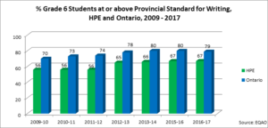 The reading scores for Grade 6 students in HPE have been increasing gradually over the last 5 years, until 2017. While the scores are still slightly below the provincial average, the gap is smaller than for other EQAO tests at the primary and junior levels.