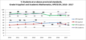 On the Applied Mathematics test, HPE grade 9 students have consistently scored above Ontario students, although in 2014 and 2016, they slipped below the Ontario average. On the academic test, HPE students’ results are more or less at the provincial average , although in the last few years, they have slipped below 80% who meet provincial standards