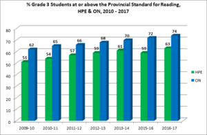 The proportion of grade 3 students who meet the provincial standard in HPE is consistently at least 10% lower than the provincial average. Despite the Ministry of Education goal of 75% of children at or above the provincial standard, fewer than 60% of grade 3 students in HPE meet or exceed that standard. There has been no significant change in the last 5 years in the Grade 3 mathematics success of HPE students.